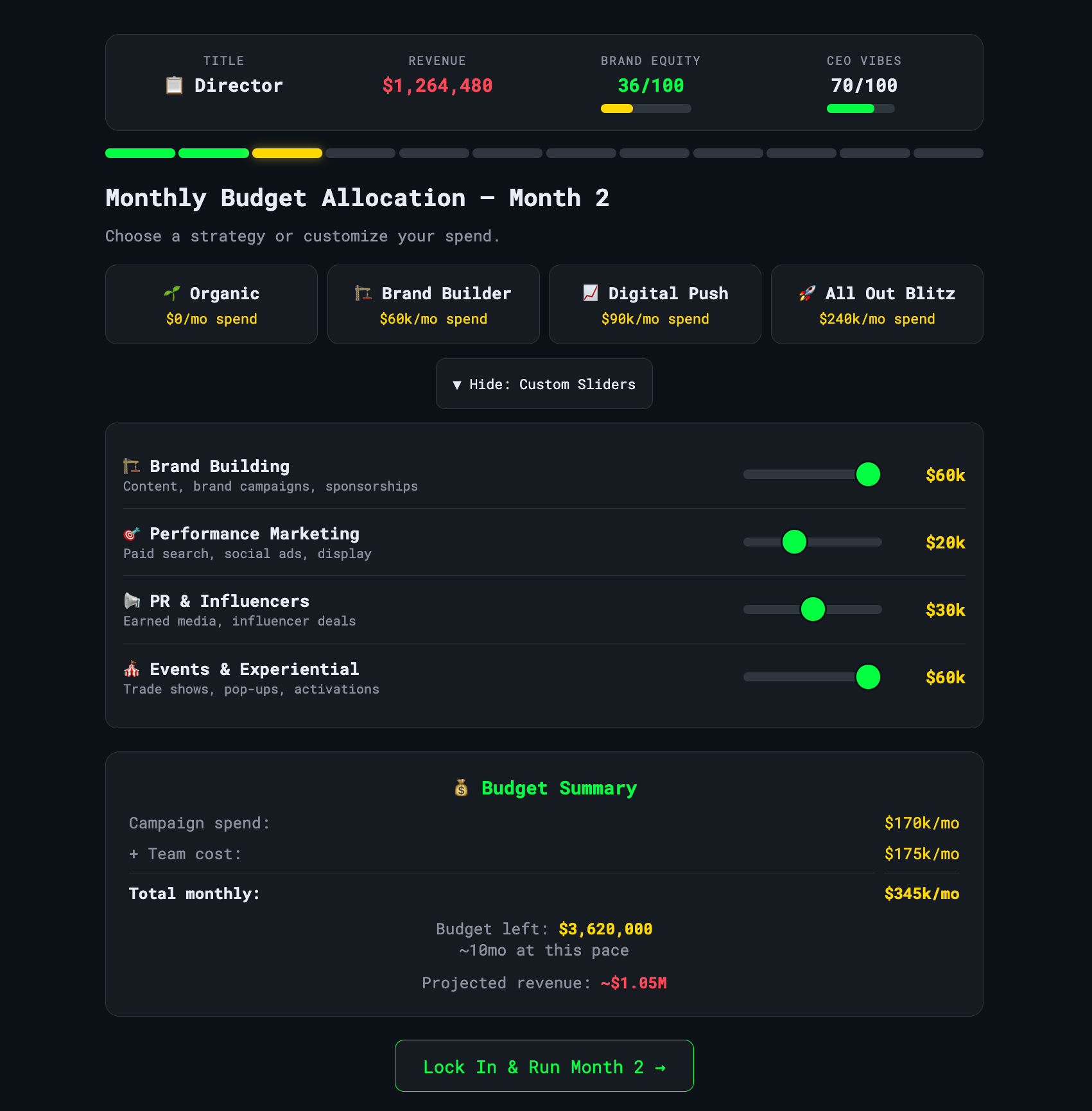 The game models something I think is underrated in marketing education: the tension between brand and performance marketing.
